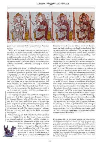 Byzantine icons. I have no definite proof yet that the painters actually employed what I call ‘icon technique’ but the results of my own application of this method look very convincingly like the originals. Further study, especially of the original and other contemporary paintings, will most probably reveal more information. While working on the copies I considered various ways of indicating (or not) original work and reconstruction. In the end, I decided not to differentiate between the two, simply because the results would have looked very odd. However, I did not invent images, scenes or figures, though always based at least on some small traces and details to build on. To help me with the reconstructions I used parallels, either from the Villa or from classical art. Some details and scenes could not be completely reconstructed yet, as there are simply not enough traces on which to build a reliable reconstruction. One hopes that suitable parallels or more missing links will still be found, enabling us to complete more of the decoration. For a future season I plan to decorate the Central Room making further use of the larger fragments found in the Villa. Now that there is a framework on the walls it should be possible to figure out where these larger blocks belong. Since some of the fragments are truly spectacular it would be a pity not to include them in the final reconstruction. We are currently working on plans to prepare the house for opening to visitors to provide them with a unique visitors centre. In the meantime, more information and numerous images can be found at www.amheida.org and on Facebook at https://www.facebook.com/pages/The-Villaof-Serenus/161742407197412.