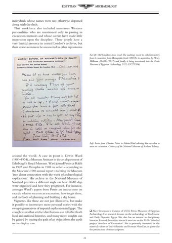 Alice Stevenson is Curator of UCL’s Petrie Museum of Egyptian Archaeology. Her research focuses on the archaeology of Predynastic and Early Dynastic Egypt. She also has an interest in disciplinary histories. Emma Libonati is a research associate on the AHRC-funded project ‘Artefacts of Excavation’. She is primarily interested in the material culture of the Hellenistic and Roman Near East, in particular the production of stone sculpture. 29
