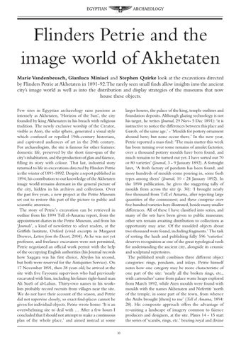 Flinders Petrie and the image world of Akhetaten Marie Vandenbeusch, Gianluca Miniaci and Stephen Quirke look at the excavations directed by Flinders Petrie at Akhetaten in 1891-92.The rarely seen small finds allow insights into the ancient city’s image world as well as into the distribution and display strategies of the museums that now house these objects. larger houses, the palace of the king, temple outlines and foundation deposits. Although glazing technology is not his target, he writes (Journal, 29 Nov- 5 Dec 1891): ‘it is instructive to notice the differences between this place and Gurob, of the same age,’ - ‘Moulds for pottery ornament abound here; but none occur there.’ In the new year, Petrie reported a mass find: ‘The main matter this week has been turning over some remains of amulet factories; over a thousand pottery moulds have been found, and much remains to be turned out yet. I have sorted out 70 or 80 varieties’ (Journal, 3 - 9 January 1892). A fortnight later, ‘A fresh factory of pendants has been found, and more hundreds of moulds come pouring in, some fresh types among them’ (Journal, 10 - 24 January 1892). In the 1894 publication, he gives the staggering tally of moulds from across the site (p. 30): ‘I brought nearly five thousand from Tell el Amarna, after rejecting large quantities of the commonest; and these comprise over five hundred varieties here illustrated, beside many smaller differences. All of these I have classified into series, and many of the sets have been given to public museums; other sets remain awaiting distribution to collections as opportunity may arise. Of the moulded objects about two thousand were found, including fragments.’ The task of sorting the hauls and publishing fully 596 ‘varieties’ deserves recognition as one of the great typological tools for understanding the ancient city, alongside its ceramic and sculptural repertoires. The published result combines three different object categories: rings, pendants, and inlays. Petrie himself notes how one category may be more characteristic of one part of the site: ‘nearly all the broken rings, etc., with cartouches’ came from palace waste heaps explored from March 1892, while Aten moulds were found with moulds with the names Akhenaten and Nefertiti ‘north of the temple, in some part of the town, from whence the Arabs brought [them] to me’ (Tell el Amarna, 1894: 28). His composite approach offers the advantage of re-uniting a landscape of imagery common to faience producers and designers, at the site. Plates 14 - 15 start the series of ‘scarabs, rings, etc.’ bearing royal and divine