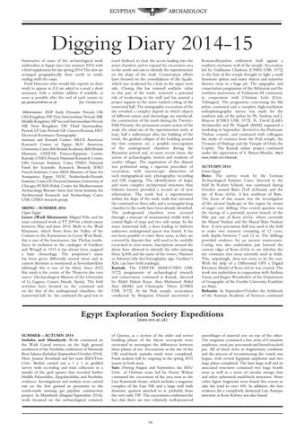 Digging Diary 2014-15 Summaries of some of the archaeological work undertaken in Egypt since late summer 2014, with a brief supplement for late spring 2014.The sites are arranged geographically from north to south, ending with the oases. Field Directors who would like reports on their work to appear in EA are asked to e-mail a short summary, with a website address if available, as soon as possible after the end of each season to: jan.geisbusch@ees.ac.uk Jan Geisbusch Abbreviations: EDP Early Dynastic Period; OK Old Kingdom; FIP First Intermediate Period; MK Middle Kingdom; SIP Second Intermediate Period; NK New Kingdom; TIP Third Intermediate Period; LP Late Period; GR Graeco-Roman; ERT Electrical Resistance Tomography. Institutes and Research Centres: ARCE American Research Center in Egypt; AUC American University, Cairo; BA British Academy; BM British Museum; CFEETK Franco-Egyptian Centre, Karnak; CNRS French National Research Centre; DAI German Institute, Cairo; FNRS National Fund for Scientific Research, Brussels; IFAO French Institute, Cairo; MSA Ministry of State for Antiquities, Egypt; NVIC Netherlands-Flemish Institute, Cairo; OI Oriental Institute, University of Chicago; PCMA Polish Centre for Mediterranean Archaeology, Warsaw; Swiss Inst Swiss Institute for Architectural Research and Archaeology, Cairo; USR CNRS research group. SRING - SUMMER 2014 Upper Egypt Luxor (Wadi Khatasum): Miguel Polo and his team continued work at TT 209 for a third season between May and June 2014. Built in the Wadi Khatasum, which flows from the Valley of the Colours to the Ramesseum in Luxor West Bank, this is one of the less-known, late Theban tombs. Since its inclusion in the catalogue of Gardiner and Weigall in 1913 it has always been assigned a Saite chronology. The proprietor’s name has been given differently several times and in current literature is mentioned as Seremhatrekhyt (although this is one of his titles). Since 2012 this tomb is the centre of the ‘Proyecto dos cero nueve’ (Archaeological Mission of the University of La Laguna, Canary Islands, Spain). The field activities have focused on the courtyard and on the first of the underground chambers, the transversal hall. In the courtyard the goal was to