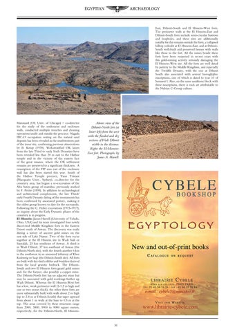 Marouard (OI, Univ. of Chicago) – co-director for the study of the settlement and enclosure walls, conducted multiple trenches and cleaning operations inside and outside the precinct. Nagada IIIC-D occupation resting on the natural sand deposits has been revealed in the southwestern part of the inner site, confirming previous observations by B. Kemp (1978). Well-stratified OK layers from the late Third to early Sixth Dynasties have been revealed less than 20 m east to the Hathor temple and in the vicinity of the eastern face of the great temenos, where the OK settlement remains are preserved to a significant thickness. A resumption of the FIP area east of the enclosure wall has also been started this year. South of the Hathor Temple precinct, Yann Tristant (Macquarie Univ., Sydney), co-director for the cemetery area, has begun a re-excavation of the Abu Suten group of mastabas, previously studied by F. Petrie (1898). In addition to archaeological and architectural complements, the late Third/ early Fourth Dynasty dating of the monuments has been confirmed by associated pottery, making it the oldest group known to date for the necropolis. Following the C. Fisher excavations (1915-1917), an inquiry about the Early Dynastic phases of the cemetery is in progress. El Hisnein: James Harrell (University of Toledo, Ohio, USA) and his team investigated four newly discovered Middle Kingdom forts in the Eastern Desert south of Aswan. The discovery was made during a survey of ancient gold mines on the east side of Lake Nasser. Two of the forts occur together at the El Hisnein site in Wadi Siali or Sayyalah, 25 km southeast of Aswan. A third is in Wadi Dihmit, 37 km southeast of Aswan (the Dihmit-North site), with the fourth another 6 km to the southwest in an unnamed tributary of Khor Kolesseig or Saqr (the Dihmit-South site). All forts are built with dry-laid cobbles and boulders derived from the local granitic bedrock. The DihmitSouth and two El Hisnein forts guard gold mines and, for the former, also possibly a copper mine. The Dihmit-North fort has no adjacent mine but may be associated with gold workings further up Wadi Dihmit. Whereas the El Hisnein-West fort has a low, weak perimeter wall (1-1.2 m high and one or two stones thick), the other three forts are more substantially built with walls about 2 m high (up to 2.4 m at Dihmit-South) that taper upward from about 1 m wide at the base to 0.5 m at the top. The areas covered by these structures range from 2000, 3800, 5900 to 9000 square meters, respectively, for the Dihmit-North, El Hisnein-