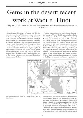 Gems in the desert: recent work at Wadi el-Hudi In May 2014, Kate Liszka and her team initiated the first Princeton University mission to Wadi el-Hudi. Hidden in an arid landscape of granite and dolerite mountainous outcrops, 35 kilometres southeast of Aswan, lie at least 14 archaeological sites in an area called Wadi elHudi. These sites include fortified settlements, amethyst mines, over 100 rock inscriptions, and even an Egyptianstyle fortress, which date to the Middle Kingdom and the Roman Period. The degree of archaeological preservation is astonishing, with sites exposed like time capsules. Dry-stone walls often stand at their original heights of approximately two metres, and artefact scatters appear on the surface where the Ancient Egyptians left them millennia ago. The patterns of artefact distribution are so clear that they can allow us to reconstruct the ancient activities that took place.
