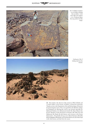 ď ą Kate Liszka is the director of the mission to Wadi el-Hudi, and a Cotsen Fellow in the Society of Fellows at Princeton University. Thanks are due to the Department of Art and Archaeology at Princeton for sponsoring the survey. She is very grateful to the Ministry of State for Antiquities for allowing this work to go forward, especially Dr. Mohamed Ibrahim, Dr. Mohammed Ismail, Mr. Hany Ahmed abo El azm, Members of the Permanent Committee, Mr. Fathy abo ziad Mahmoud, Mr. Shazly Ali abd elaziem, and everyone in the Aswan Inspectorate. Deep thanks also go out to Bryan Kraemer, Meredith Brand, Magdalena Wlodarska, and Nicholas Brown for all of their hard work, observations, and data from the season. 40