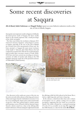 Some recent discoveries at Saqqara Ali el-Batal, Saleh Soleiman and Ragab Turkey report on some hitherto unknown tombs at the site of Gisr el-Mudir, Saqqara. Among the most impressive tombs in Egypt are brilliantly decorated private tombs of Saqqara, but those usually shown to the tourists represent only a small percentage of the whole necropolis. The three years before the revolution of January 2011 witnessed intensive Egyptian archaeological activity at Saqqara, especially in the area of the Gisr el-Mudir site. Located west of the step pyramid of Zoser and the Unas pyramid at Saqqara, the name means ‘enclosure of the mudir’ (= director), after Selim Hassan who had conducted excavations here.This site has escaped attention until recently; three successive seasons of work (20082010) have now been carried out, revealing an extensive cemetery of nobles of modest rank dating to the Old Kingdom along the north side of the pyramid enclosure of Sekhemkhet (Third Dynasty).
