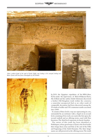 In 2010, the Egyptian expedition of the MSA (then SCA) under the supervision of Abd el-Hakeem Karer, Ali el-Batal and the author (Saleh Soleiman) discovered a further Old Kingdom tomb within the cemetery, a somewhat unexpected find as no other tomb of comparable decoration had been discovered among the 25 tombs of nobles and 150 commoner tombs excavated since 2008. It consists of three levels: a top one representing its core, surrounded by an enclosure wall; a chapel on its second level, consisting of two rock-cut courts (the first open, the second vaulted) and an offering room, cased with Tura limestone. The third level represents its burial chamber. The owner of this tomb has been identified as Ptahshepses, whose good name is Tjemi, who lived under three kings (Isesi, Unas and Teti) at the end of the Fifth and beginning of the Sixth Dynasties. The three kings’ names are still preserved in the offering room. The tomb 42