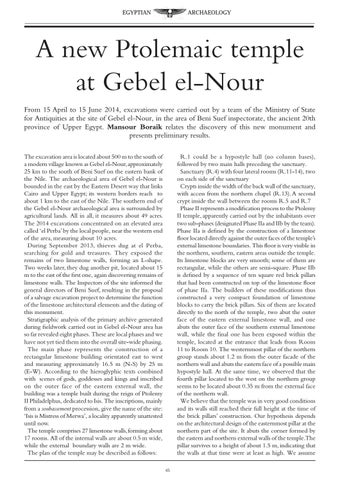 A new Ptolemaic temple at Gebel el-Nour From 15 April to 15 June 2014, excavations were carried out by a team of the Ministry of State for Antiquities at the site of Gebel el-Nour, in the area of Beni Suef inspectorate, the ancient 20th province of Upper Egypt. Mansour Boraik relates the discovery of this new monument and presents preliminary results. The excavation area is located about 500 m to the south of a modern village known as Gebel el-Nour, approximately 25 km to the south of Beni Suef on the eastern bank of the Nile. The archaeological area of Gebel el-Nour is bounded in the east by the Eastern Desert way that links Cairo and Upper Egypt; its western borders reach to about 1 km to the east of the Nile. The southern end of the Gebel el-Nour archaeological area is surrounded by agricultural lands. All in all, it measures about 49 acres. The 2014 excavations concentrated on an elevated area called ‘el Perba’ by the local people, near the western end of the area, measuring about 10 acres. During September 2013, thieves dug at el Perba, searching for gold and treasures. They exposed the remains of two limestone walls, forming an L-shape. Two weeks later, they dug another pit, located about 15 m to the east of the first one, again discovering remains of limestone walls. The Inspectors of the site informed the general directors of Beni Suef, resulting in the proposal of a salvage excavation project to determine the function of the limestone architectural elements and the dating of this monument. Stratigraphic analysis of the primary archive generated during fieldwork carried out in Gebel el-Nour area has so far revealed eight phases. These are local phases and we have not yet tied them into the overall site-wide phasing. The main phase represents the construction of a rectangular limestone building orientated east to west and measuring approximately 16.5 m (N-S) by 25 m (E-W). According to the hieroglyphic texts combined with scenes of gods, goddesses and kings and inscribed on the outer face of the eastern external wall, the building was a temple built during the reign of Ptolemy II Philadelphus, dedicated to Isis. The inscriptions, mainly from a soubassement procession, give the name of the site: ‘Isis is Mistress of Merwa’, a locality apparently unattested until now. The temple comprises 27 limestone walls, forming about 17 rooms. All of the internal walls are about 0.5 m wide, while the external boundary walls are 2 m wide. The plan of the temple may be described as follows: