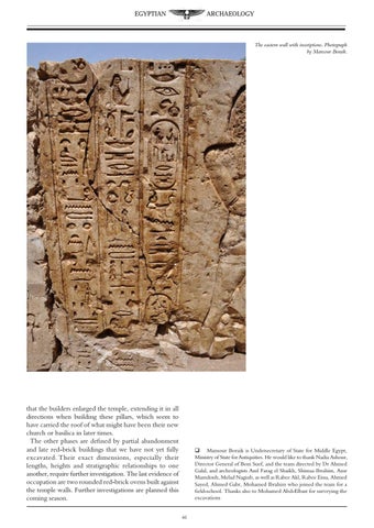 ď ą Mansour Boraik is Undersecretary of State for Middle Egypt, Ministry of State for Antiquities. He would like to thank Nadia Ashour, Director General of Beni Suef, and the team directed by Dr Ahmed Galal, and archeologists Aml Farag el Shaikh, Shimaa Ibrahim, Amr Mamdouh, Melad Nagiub, as well as Rabee Akl, Rabee Eissa, Ahmed Sayed, Ahmed Gabr, Mohamed Ibrahim who joined the team for a field-school. Thanks also to Mohamed Abd-Elbast for surveying the excavations 46