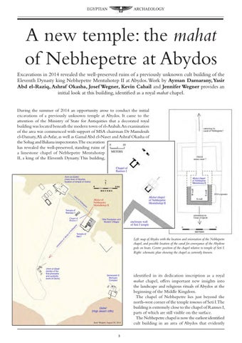 A new temple: the mahat of Nebhepetre at Abydos Excavations in 2014 revealed the well-preserved ruins of a previously unknown cult building of the Eleventh Dynasty king Nebhepetre Mentuhotep II at Abydos. Work by Ayman Damarany, Yasir Abd el-Raziq, Ashraf Okasha, Josef Wegner, Kevin Cahail and Jennifer Wegner provides an initial look at this building, identified as a royal mahat chapel. During the summer of 2014 an opportunity arose to conduct the initial excavations of a previously unknown temple at Abydos. It came to the attention of the Ministry of State for Antiquities that a decorated royal building was located beneath the modern town of el-Arabah.An examination of the area was commenced with support of MSA chairman Dr Mamdouh el-Damaty, Ali al-Asfar, as well as Gamal Abd el-Naser and Ashraf Okasha of the Sohag and Baliana inspectorates.The excavation has revealed the well-preserved, standing ruins of a limestone chapel of Nebhepetre Mentuhotep II, a king of the Eleventh Dynasty. This building,
