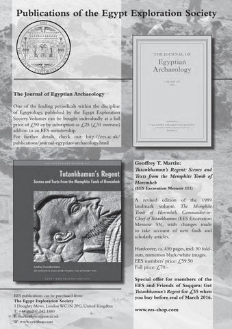EES publications can be purchased from: The Egypt Exploration Society 3 Doughty Mews, London WC1N 2PG, United Kingdom T: +44 (0)207 242 1880 E: maria.idowu@ees.ac.uk W: www.ees-shop.com