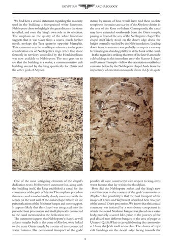 possibly all were constructed with respect to long-lived water features that lay within the floodplain. How did the Nebhepetre mahat, and the king’s new canal function in the context of the gods’ ceremonies at Abydos? One possibility is that the boat transport of the images of Osiris and Wepwawet described here was part of the annual Osiris procession.We know that this annual ceremony was initiated by a waterborne component in which the sacred Neshmet barque was placed on a water body, probably a sacred lake, prior to the journey of the god aboard two different barques to the area of peqer at Umm el-Qa’ab.What occurred following the ceremonies at Umm el-Qa’ab itself is less clear. The cluster of royal cult buildings on the desert edge facing towards the 6