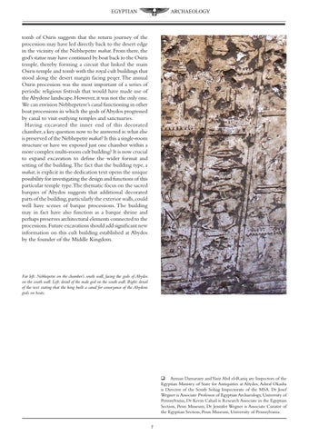 tomb of Osiris suggests that the return journey of the procession may have led directly back to the desert edge in the vicinity of the Nebhepetre mahat. From there, the god’s statue may have continued by boat back to the Osiris temple, thereby forming a circuit that linked the main Osiris temple and tomb with the royal cult buildings that stood along the desert margin facing peqer. The annual Osiris procession was the most important of a series of periodic religious festivals that would have made use of the Abydene landscape. However, it was not the only one. We can envision Nebhepetere’s canal functioning in other boat processions in which the gods of Abydos progressed by canal to visit outlying temples and sanctuaries. Having excavated the inner end of this decorated chamber, a key question now to be answered is: what else is preserved of the Nebhepetre mahat? Is this a single-room structure or have we exposed just one chamber within a more complex multi-room cult building? It is now crucial to expand excavation to define the wider format and setting of the building. The fact that the building type, a mahat, is explicit in the dedication text opens the unique possibility for investigating the design and functions of this particular temple type. The thematic focus on the sacred barques of Abydos suggests that additional decorated parts of the building, particularly the exterior walls, could well have scenes of barque processions. The building may in fact have also function as a barque shrine and perhaps preserves architectural elements connected to the processions. Future excavations should add significant new information on this cult building established at Abydos by the founder of the Middle Kingdom.