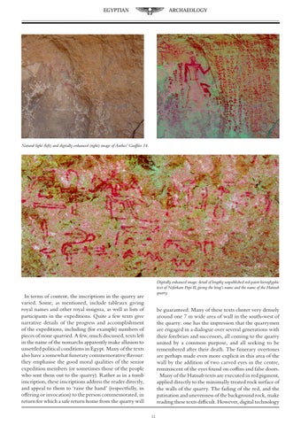 be guaranteed. Many of these texts cluster very densely around one 7 m wide area of wall in the south-west of the quarry: one has the impression that the quarrymen are engaged in a dialogue over several generations with their forebears and successors, all coming to the quarry united by a common purpose, and all seeking to be remembered after their death. The funerary overtones are perhaps made even more explicit in this area of the wall by the addition of two carved eyes in the centre, reminiscent of the eyes found on coffins and false doors. Many of the Hatnub texts are executed in red pigment, applied directly to the minimally treated rock surface of the walls of the quarry. The fading of the red, and the patination and unevenness of the background rock, make reading these texts difficult. However, digital technology 11