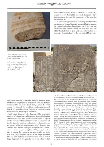 reliefs of Nectanebo. It can be attributed to an undated sphinx of about double life-size. Such statues may have been rearranged within the sanctuaries of the later first millennium bc. The forthcoming season will be mainly devoted to the excavation of the neighbouring squares. Current support by various institutions, foundations and donors, such as the American Research Center in Egypt, will offer one of the final chances to gain first-hand information of a sanctuary from the heart of the sun cult at Heliopolis.
