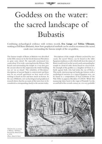 Goddess on the water: the sacred landscape of Bubastis Combining archaeological evidence with written records, Eva Lange and Tobias Ullmann, working at Tell Basta (Bubastis), show how geophysical methods can be used to reconstruct the sacred canals once surrounding the famous temple of the cat goddess. The famous temple of Bastet at Bubastis was described in the fifth century bc by the Greek historian Herodotus in quite some detail. He especially mentioned two canals about 30 m wide, sourcing from the Pelusiac Nile branch and surrounding the temple in a way that gave the ancient observer the impression the whole building was set ‘on an island’. The reliability of Herodotus’ descriptions of ancient Egypt is controversial and there may be no overall agreement on how much of his writings is based on fact and how much on fiction. In the case of Bubastis, new archaeological and geophysical research shows that his accounts of the town have to be considered as corresponding closely to the ancient reality.