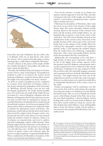 Great One, the Lady of Bubastis, the Eye of Ra, who is in Behedet, [who sits on the] throne, who smites the enemies, who is protected by [the gods], in whose entourage Ipi is, under [whose temple] the Nile flows’. On the columns in the pronaos of the temple of Edfu she is further described as ‘this goddess, the noble one, under whom the Nile flows’. Recently, the Tell Basta Project has begun to test these textual sources using archaeological and geophysical methods in order to reconstruct the ancient sacred landscape of Bubastis, created by human efforts around the temple of its main goddess over many centuries. In 2008 we started a geophysical survey, conducted by scientists of the University of Potsdam, which is now being continued by geographers of the University of Würzburg. Already during a first test run with the fluxgate gradiometer, the results showed possible traces of a canal in the area south of the temple. Rescue excavation by a team of Egyptian colleagues from the Ministry of Antiquities (then SCA) in the same area one year later revealed what we interpreted as remains of canal fill: thick layers of solid dark mud, virtually devoid of small finds or pottery. In the last season (spring 2015), characteristics of these sediments were analysed in order to identify the depositional system and history. The preliminary results indicate that the facies (rock unit) is characterized by a high content of organic matter, very fine particle sizes (silt to clay), absence of coarse material (sand) and medium content of carbonate. About 2 m of sediment are exposed today and reveal a uniform and solid morphology without visible layering. These findings suggest that the sedimentary environment was probably characterized by the presence of standing or very slow-flowing water. Further, the observed high content of organic matter and carbonate make the presence of adjacent gardens or agricultural fields likely. These considerations fit Herodotus’ description of the canals as unconnected and without an outlet: