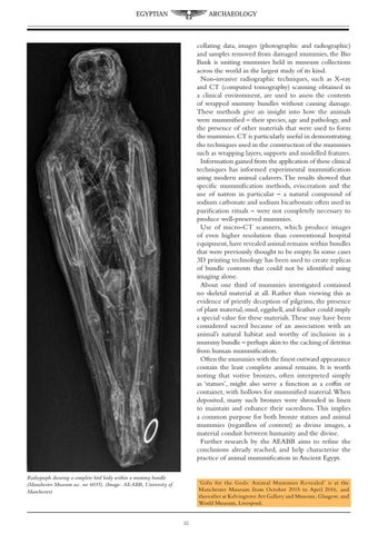 ‘Gifts for the Gods: Animal Mummies Revealed’ is at the Manchester Museum from October 2015 to April 2016, and thereafter at Kelvingrove Art Gallery and Museum, Glasgow, and World Museum, Liverpool. 22