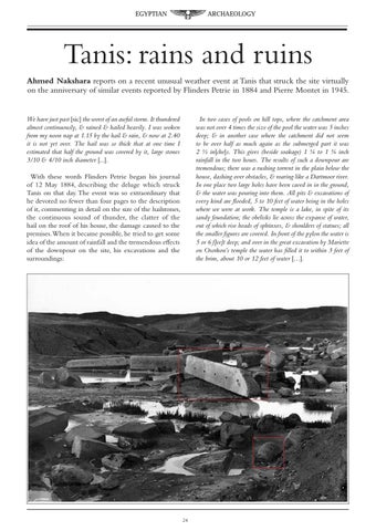 Tanis: rains and ruins Ahmed Nakshara reports on a recent unusual weather event at Tanis that struck the site virtually on the anniversary of similar events reported by Flinders Petrie in 1884 and Pierre Montet in 1945. We have just past [sic] the worst of an awful storm. It thundered almost continuously, & rained & hailed heavily. I was woken from my noon nap at 1.15 by the hail & rain, & now at 2.40 it is not yet over. The hail was so thick that at one time I estimated that half the ground was covered by it, large stones 3/10 & 4/10 inch diameter [...].