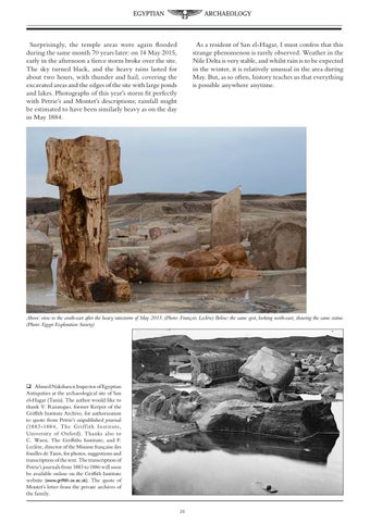 Surprisingly, the temple areas were again flooded during the same month 70 years later: on 14 May 2015, early in the afternoon a fierce storm broke over the site. The sky turned black, and the heavy rains lasted for about two hours, with thunder and hail, covering the excavated areas and the edges of the site with large ponds and lakes. Photographs of this year’s storm fit perfectly with Petrie’s and Montet’s descriptions; rainfall might be estimated to have been similarly heavy as on the day in May 1884.