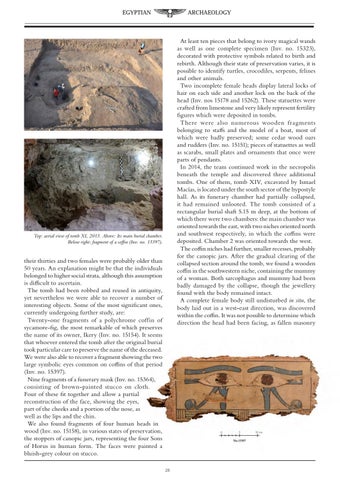 Top: aerial view of tomb XI, 2013. Above: Its main burial chamber. Below right: fragment of a coffin (Inv. no. 15397).