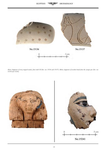 Above: fragments of ivory magical wands, from tomb XI (Inv. nos 15136 and 15137). Below: fragments of wooden heads from the canopic jars (Inv. nos 15158 and 15241).