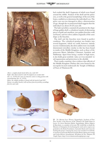 had crushed the skull, fragments of which were found around the rubble. Analysis of the skull and the pelvic area, as well as the general morphology of the rest of the bones, enabled us to determine the individual’s sex. The pelvic area was too damaged to allow a determination of age, though the reconstructed skull suggests that the individual was about 20-25 years old. The lady’s jewellery consisted of a pendant in the shape of large golden shell; a cylindrical amulet of alternating pieces of gold and amethyst; two golden bracelets with reef knots; and two silver anklets originally of the same shape as the bracelets. The shell and the bracelets were found in perfect condition. The cylindrical pendant was broken into several fragments, which we could, however, entirely recover. Unfortunately, the silver anklets were very badly deteriorated. Jewellery similar to this has been found in tombs of the Middle Kingdom, such as those of the princesses Meret, Sithathor, Chnumet, Senebtisi and Nubhotepi. Apart from being a marker of high status, it also holds great symbolic value as it was intended to aid regeneration and protection in the afterlife. These tombs constitute clear evidence that officials of the Middle Kingdom Theban elite were buried in the necropolis located underneath the Temple of Millions of Years of Thutmosis III. Above: a complete female burial still in situ, tomb XIV. Right: other objects found in tomb XI: fragment of a wooden duck (Inv. no. 15130) and a piece of a limestone statue in sitting position with outstretched legs (Inv. no. 15125). Below: the complete jewellery set found with the burial of tomb XIV. Bottom: two golden bracelets with reef knots from the jewellery assemblage from the same tomb.