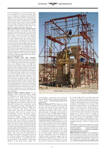Western Thebes (Dra Abu el-Naga): Between Dec 2014 and Jan 2015 Boyo Ockinga’s team of Macquarie Univ excavated the courtyard of TT 149 (see pp. 40-42). Two main occupation phases were identified above the 20th Dyn structure: Late Antique (Coptic) and TIP. From the former phase, fragments of Greek and Coptic papyri were recovered (including a fragment of the Sahidic version of Genesis). In the latter phase two shafts and burial complexes were excavated in the NW and SW corners of the courtyard, enclosed by mud-brick walls. Remains of the original 20th Dyn courtyard architecture were also uncovered: sandstone column and pillar bases, foundation blocks for the revetment blocks of the courtyard walls, as well as column, pillar and ceiling fragments. Numerous inscribed and decorated fragments were also found, including one with the cartouche of Ramesses VII, part of a window of appearances scene, allowing to date the tomb and its owner securely to the latter part of the 20th Dyn. Western Thebes (Medinet Habu): The OI epigraphic team in the small Amun temple of Hatshepsut and Thutmosis III under the supervision of J. Brett McClain finished the final drawings for Medinet Habu X and continued work on Medinet Habu XI and XII. Epigrapher Jen Kimpton assisted by Anait Helmholz continued her preliminary survey and cataloguing of blocks and fragments of the destroyed Medinet Habu W High Gate. Senior conservator Lotfi Hassan assisted by Nahed Samir supervised the Medinet Habu conservation work and the second year of the Epigraphic Survey’s conservation student training programme for 14 local Egyptian conservation students. Master mason Frank Helmholz assisted by mason Johannes Weninger and the stone team finished re-erecting the Domitian Gate with new sandstone blocks that replace the lowest courses destroyed by ground water salt. Tina Di Cerbo and Richard Jasnow continued their digital documentation of LP and medieval graffiti in the N Ptolemaic annex of the small Amun temple, a Ptolemaic gate on the S, plus the roof area of the Ramesses III mortuary temple. This season saw the collaboration of Chicago House and the Ramesseum team led by Christian LeBlanc and Philippe Martinez in the documentation of reused blocks from the Ramesseum in the Ptolemaic and Roman additions to the small Amun temple. The