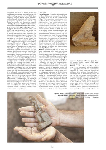 Saqqara: The Leiden Museum/Leiden Univ team, now together with its new partner, the Museo Egizio of Turin and directed by Maarten J. Raven and Christian Greco, continued the fieldwork in the NK necropolis at Saqqara. The substructure of the anonymous 18th-Dyn tomb excavated in 2013 (‘tomb X’, see EA 43) was emptied and proved to consist of a 7.9 m deep shaft and two burial chambers, connected by a stairway. The stairway and lower chamber had already been explored in 2002 via a robbers’ tunnel from the adjacent tomb of Meryneith. The shaft and upper chamber contained some loose relief fragments, bricks stamped with the name of Amenhotep II, and other finds, but did not provide information on the identity of the tomb-owner. Two shallow platform structures against the W wall of the courtyard of tomb X contained a great quantity of broken pottery, mainly red funnel-necked jars and blue-painted ovoid jars. E of the tomb, a Ramesside floor level of rubble and potsherds was exposed. Here, a large shaft was emptied, again containing some relief blocks among which was one inscribed for Meryneith. It gives access to at least three tombchambers, which could not be explored due to lack of time. The shaft probably dates to the 18th Dyn and may be connected to some mud-brick walls enclosing the rubble floor in the S and E. In the debris to the S a large limestone falcon figure was discovered, probably from a private cult chapel of a Ramesside tomb. The removal of an accumulation of sand and rubble against the N wall of tomb X produced an in situ four-sided stela of a stonecutter, Samut. The expedition also consolidated the walls of the tomb of Sethnakht further E, which was then backfilled for protection. www.saqqara.nl