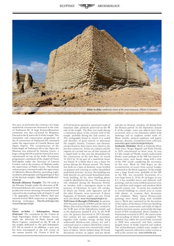 3.10 m) has been opened in a pavement made of limestone slabs, perfectly preserved on the W side of the temple. The floor was made during a restoration phase of the exterior wall of the temple, probably during the 2nd century ad. The stratigraphy found in trench 8 is sealed and therefore of great interest to determine the temple’s history. Ceramics and Demotic ostraka found in these layers were dated to the late first century bc. A base of a column and the imprint of a second one are all that remains of a chapel built in this area but demolished for the construction of the new floor. In trench 10 (10.5 by 10 m) part of a mud-brick house was found. It is likely that it was a house for priests during the Roman period. The house was built on a layer of domestic waste levelled on purpose and covering an earlier demolished mud-brick structure. In turn, this building was built directly on a previously demolished mudbrick building. So far, three building phases could be identified in the area. The temenos was still inhabited during the Byzantine Period: an ostrakon with a staurogram attests to the presence of Christians. In total, 181 ostraka, of which one Greek, some figurative and all the other Demotic, were recovered. A dozen fragments of Demotic papyri and one Greek were also found. www-museopapirologico.eu Tell Umm el-Baragât (Tebtunis): In autumn 2014 the joint mission of IFAO and the Univ of Milan, directed by Claudio Gallazzi, worked in the N-W part of the Soknebtunis temple and in the depository mound E of it. In the N-W area, the granary discovered in 2013 (secondfirst century bc) was completely unearthed, together with another storage facility lying underneath (third-second century bc) and a courtyard used as a bakery (third-first century bc). The whole sector was covered with a thick layer of debris, which yielded about 50 Greek documents written on papyri and pot sherds 35
