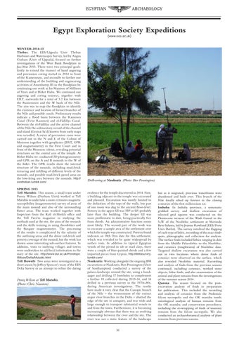 WINTER 2014-15 Thebes: The EES/Uppsala Univ Theban Harbours and Waterscapes Survey, led by Angus Graham (Univ of Uppsala), focused on further investigations of the West Bank floodplain in Jan-Mar 2015. There were two principal goals: firstly to extend the transect of hand augering and percussion coring started in 2014 in front of the Ramesseum, and secondly to further our understanding of the building and engineering activities of Amenhotep III in the floodplain by continuing our work at his Mansion of Millions of Years and at Birket Habu. We continued our augering and coring transect, together with ERT, eastwards for a total of 3.2 km between the Ramesseum and the W bank of the Nile. The aim was to map the floodplain to identify the existence and location of former branches of the Nile and possible canals. Preliminary results indicate a flood basin between the Ramesses Canal (Tir’at Rameses) and el-Fâdilîya Canal. Between the el-Fâdilîya and the active channel of the Nile the sedimentary record of the channel and island (Gezirat Sa’d) known from early maps was recorded. A series of percussion cores were carried out to the N and E of the Colossi of Memnon together with geophysics (ERT, GPR and magnetometry) in the First Court and in front of the Memnon colossi, revealing potential structures on the central axis of the temple. At Birket Habu we conducted 3D photogrammetry and GPR on the A and B mounds to the W of the birket. The GPR results show the internal structure of the mounds, including mud-brick terracing and infilling of different levels of the mounds, and possible mud-brick paved areas on the low-lying area between the mounds. http:// eestheban.tumblr.com/