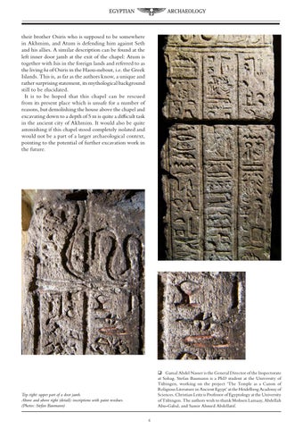 their brother Osiris who is supposed to be somewhere in Akhmim, and Atum is defending him against Seth and his allies. A similar description can be found at the left inner door jamb at the exit of the chapel: Atum is together with Isis in the foreign lands and referred to as the living ba of Osiris in the Haou-nebout, i.e. the Greek Islands. This is, as far as the authors know, a unique and rather surprising statement, its mythological background still to be elucidated. It is to be hoped that this chapel can be rescued from its present place which is unsafe for a number of reasons, but demolishing the house above the chapel and excavating down to a depth of 5 m is quite a difficult task in the ancient city of Akhmim. It would also be quite astonishing if this chapel stood completely isolated and would not be a part of a larger archaeological context, pointing to the potential of further excavation work in the future.