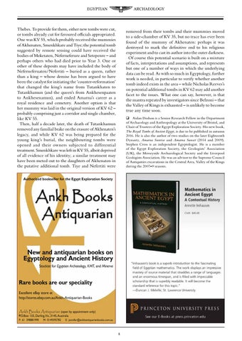 removed from their tombs and their mummies moved to a side-chamber of KV 35, but no trace has ever been found of the mummy of Akhenaten: perhaps it was destroyed to mark the definitive end to his religious experiment and to cast its author into the outer darkness. Of course this potential scenario is built on a mixture of facts, interpretations and assumptions, and represents but one of a number of ways in which the underlying data can be read. As with so much in Egyptology, further work is needed, in particular to verify whether another tomb indeed exists in the area – while Nicholas Reeves’s on potential additional tombs in KV 62 may add another facet to the issues. What one can say, however, is that the mantra repeated by investigators since Belzoni – that the Valley of Kings is exhausted – is unlikely to become true any time soon. Aidan Dodson is a Senior Research Fellow in the Department of Archaeology and Anthropology at the University of Bristol, and Chair of Trustees of the Egypt Exploration Society. His new book, The Royal Tombs of Ancient Egypt, is due to be published in autumn 2016. He is also the author of two studies on the later Eighteenth Dynasty, Amarna Sunrise and Amarna Sunset (2014 and 2009). Stephen Cross is an independent Egyptologist. He is a member of the Egypt Exploration Society, the Geologists’ Association (UK), the Merseyside Archaeological Society and the Liverpool Geologists Association. He was an advisor to the Supreme Council of Antiquities excavations in the Central Area, Valley of the Kings during the 2007–9 seasons.