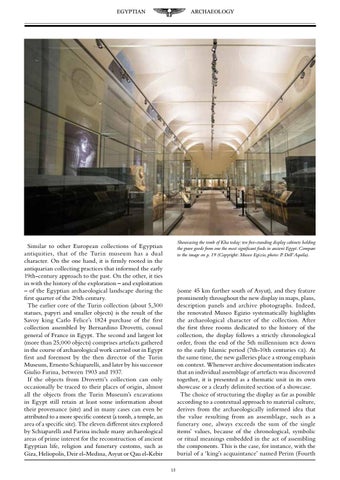 (some 45 km further south of Asyut), and they feature prominently throughout the new display in maps, plans, description panels and archive photographs. Indeed, the renovated Museo Egizio systematically highlights the archaeological character of the collection. After the first three rooms dedicated to the history of the collection, the display follows a strictly chronological order, from the end of the 5th millennium bce down to the early Islamic period (7th-10th centuries ce). At the same time, the new galleries place a strong emphasis on context. Whenever archive documentation indicates that an individual assemblage of artefacts was discovered together, it is presented as a thematic unit in its own showcase or a clearly delimited section of a showcase. The choice of structuring the display as far as possible according to a contextual approach to material culture, derives from the archaeologically informed idea that the value resulting from an assemblage, such as a funerary one, always exceeds the sum of the single items’ values, because of the chronological, symbolic or ritual meanings embedded in the act of assembling the components. This is the case, for instance, with the burial of a ‘king’s acquaintance’ named Perim (Fourth 15