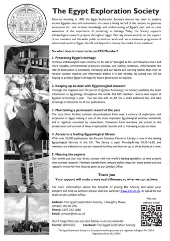 Don’t forget that you can also follow us on social media! Twitter: @TheEES Facebook: The Egypt Exploration Society The Egypt Exploration Society is a Company limited by guarantee and registered in England No. 25816. Registered charity No.212384