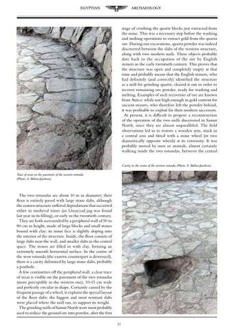 stage of crushing the quartz blocks just extracted from the mine. This was a necessary step before the washing and melting operations to extract gold from the quartz ore. During our excavations, quartz powder was indeed discovered between the slabs of the western structure, along with two modern nails. These objects probably date back to the occupation of the site by English miners in the early twentieth century. This proves that the structure was open and completely empty at that time and probably means that the English miners, who had definitely (and correctly) identified the structure as a mill for grinding quartz, cleared it out in order to recover remaining ore powder, ready for washing and melting. Examples of such recoveries of ore are known from Attica: while not high enough in gold content for ancient miners, who therefore left the powder behind, it was profitable to exploit for their modern successors. At present, it is difficult to propose a reconstruction of the operation of the two mills discovered in Samut North, since they are almost unparalleled. The field observations led us to restore a wooden arm, stuck in a central axis and fitted with a stone wheel (or two diametrically opposite wheels) at its extremity. It was probably moved by men or animals, almost certainly walking inside the two rotundas, between the central Cavity in the center of the western rotunda (Photo: A. BĂźlow-Jacobsen). Trace of wear on the pavement of the western rotunda (Photo: A. BĂźlow-Jacobsen).