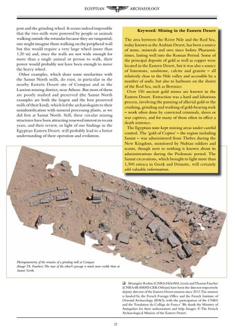 post and the grinding wheel. It seems indeed impossible that the two mills were powered by people or animals walking outside the rotundas because they are tangential; one might imagine them walking on the peripheral wall but this would require a very large wheel (more than 1.20 m) and, since the walls are not wide enough for more than a single animal or person to walk, their power would probably not have been enough to move the heavy wheel. Other examples, which share some similarities with the Samut North mills, do exist, in particular in the nearby Eastern Desert site of Compasi and in the Laurion mining district, near Athens. But most of them are poorly studied and preserved (the Samut North examples are both the largest and the best preserved mills of their kind), which led the archaeologists to their misidentification with mineral processing plants, as we did first at Samut North. Still, these circular mining structures have been attracting renewed interest in recent years, and their review, in light of our findings in the Egyptian Eastern Desert, will probably lead to a better understanding of their operation and evolution.