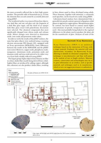 the most accurately reflected due to their high atomic number. The periodic table of elementals (see p. 27) lists the elements that can and cannot be accurately detected using pXRF. The weathered surface was removed from four objects: one dark blue and one red glass rod, the fragment of a dark blue glass ingot, and the shard of an opaque dark blue glass vessel with polychrome decoration were selected. The chemical compounds that most significantly changed were silicon oxide and calcium oxide. Minor changes were detected in aluminium oxide, iron oxide and potassium oxide values. In order to verify the results of the pXRF analyses, the same four glass objects were analysed using a scanning electron microscope FEI Quanta 400, equipped with an X-ray spectrometer (SEM-EDX). Some differences between the results of the SEM-EDX and the pXRF were noted. However, copper oxide, phosphorus oxide, manganese, aluminium oxide, potassium oxide and titanium oxide and iron oxide proved to be either very or at least fairly reliably reflected using pXRF. The largest group of glass objects from Amarna are blue in colour, darker blue usually being derived from cobalt. Lighter blues are produced by adding copper, although this colourant can also produce darker blues, resulting