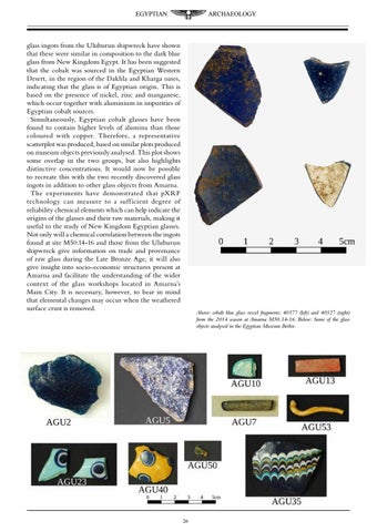 glass ingots from the Uluburun shipwreck have shown that these were similar in composition to the dark blue glass from New Kingdom Egypt. It has been suggested that the cobalt was sourced in the Egyptian Western Desert, in the region of the Dakhla and Kharga oases, indicating that the glass is of Egyptian origin. This is based on the presence of nickel, zinc and manganese, which occur together with aluminium in impurities of Egyptian cobalt sources. Simultaneously, Egyptian cobalt glasses have been found to contain higher levels of alumina than those coloured with copper. Therefore, a representative scatterplot was produced, based on similar plots produced on museum objects previously analysed. This plot shows some overlap in the two groups, but also highlights distinctive concentrations. It would now be possible to recreate this with the two recently discovered glass ingots in addition to other glass objects from Amarna. The experiments have demonstrated that pXRF technology can measure to a suff icient degree of reliability chemical elements which can help indicate the origins of the glasses and their raw materials, making it useful to the study of New Kingdom Egyptian glasses. Not only will a chemical correlation between the ingots found at site M50.14-16 and those from the Uluburun shipwreck give information on trade and provenance of raw glass during the Late Bronze Age, it will also give insight into socio-economic structures present at Amarna and facilitate the understanding of the wider context of the glass workshops located in Amarna’s Main City. It is necessary, however, to bear in mind that elemental changes may occur when the weathered surface crust is removed.