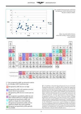 (LBA = Late Bronze Age) I would like to thank the Egypt Exploration Society for kindly funding this pilot study. I would also like to thank the supporting institutions and persons involved in the analytical series: Friederike Seyfried, director of the Egyptian Museum Berlin and conservator Nina Loschwitz, the excellence cluster TOPOI, particularly Michael Mayer and Gerwulf Schneider for providing the instrument and reference materials, and the representatives of the Institute of Geographical Sciences of the Freie Universität Berlin: Philipp Hoelzmann and Frank Kutz, the latter having acted as radiation officer and supervising the pXRF measurements. I would also like to thank Ina Reiche and Stefan Röhrs of the Rathgen-Forschungslabor for the SEM-EDX measurements and for lending me reference materials, and Markus Ostermann and Manfred Torge at the Federal Institute for Materials Research and Testing, who also provided glass standards. I am furthermore very grateful to Caroline Jackson and Paul Nicholson who provided invaluable advice. 27