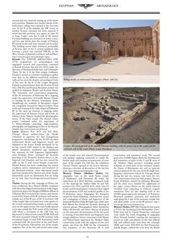 Coptos: the southern wall of the ruined Christian building, with the paved way to the south and the red-brick wall to the north (Photo: Laure Pantalacci). of the temple were also restored. Documentation and database updating continued, to enable the further study and eventual reconstruction of some parts of the temple. On 12th Dec the exhibition ‘Eternal Thebes’ opened at the Luxor Museum, showing a selection of discoveries of the last few years. http://thutmosisiiitempleproject.org/ Western Thebes (Medinet Habu): The epigraphic team in the small Amun temple of Hatshepsut and Thutmosis III under the supervision of J. Brett McClain continued work on the drawings for Medinet Habu XI and XII, between Oct 2015 and Feb 2016, while Tina Di Cerbo and Richard Jasnow continued their digital documentation of LP and medieval graffiti in the N Ptolemaic annex. Epigrapher Jen Kimpton, assisted by Anait Helmholz, continued the survey and cataloguing of blocks and fragments of the destroyed Medinet Habu W High Gate, while artist Keli Alberts has started the facsimile drawing of selected groups. Photographers Yarko Kobylecky, Hilary McDonald, and Owen Murray all worked on the systematic documentation of the area prior to moving of inscribed blocks and fragments onto storage platforms. Senior conservator Lotfi Hassan and Nahed Samir supervised the Medinet Habu conservation work with the support of two new grants, one from the RBF for the continuation and expansion of the Ramesses III S well