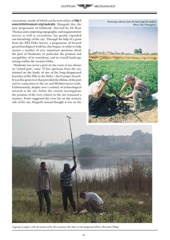 excavations, results of which can be seen online at http:// www.britishmuseum.org/naukratis. Alongside this, the new programme of fieldwork, directed by Dr Ross Thomas and comprising topographic and magnetometer surveys as well as excavations, has greatly expanded our knowledge of the city. Through the help of a grant from the EES Delta Survey, a programme of focused geoarchaeological work has also begun, in order to help answer a number of very important questions about the port of Naukratis: in particular the position and navigability of its waterfront, and its overall landscape setting within the western Delta. Naukratis was never a port on the coast; it was always an ‘inland port’, some 70 km upstream from the sea, situated on the banks of one of the long-disappeared branches of the Nile in the Delta – the Canopic branch. It was this great river that provided the lifeline of the port and its connection to the sea and Mediterranean trade. Unfortunately, despite over a century of archaeological research at the site, before the current investigations the position of the river relative to the site remained a mystery. Petrie suggested the river lay on the western side of the site; Hogarth instead thought it was on the