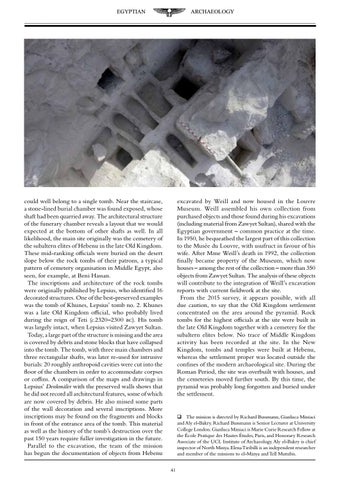 could well belong to a single tomb. Near the staircase, a stone-lined burial chamber was found exposed, whose shaft had been quarried away. The architectural structure of the funerary chamber reveals a layout that we would expected at the bottom of other shafts as well. In all likelihood, the main site originally was the cemetery of the subaltern elites of Hebenu in the late Old Kingdom. These mid-ranking officials were buried on the desert slope below the rock tombs of their patrons, a typical pattern of cemetery organisation in Middle Egypt, also seen, for example, at Beni Hassan. The inscriptions and architecture of the rock tombs were originally published by Lepsius, who identified 16 decorated structures. One of the best-preserved examples was the tomb of Khunes, Lepsius’ tomb no. 2. Khunes was a late Old Kingdom official, who probably lived during the reign of Teti (c.2320–2300 bc). His tomb was largely intact, when Lepsius visited Zawyet Sultan. Today, a large part of the structure is missing and the area is covered by debris and stone blocks that have collapsed into the tomb. The tomb, with three main chambers and three rectangular shafts, was later re-used for intrusive burials: 20 roughly anthropoid cavities were cut into the floor of the chambers in order to accommodate corpses or coffins. A comparison of the maps and drawings in Lepsius’ Denkmäler with the preserved walls shows that he did not record all architectural features, some of which are now covered by debris. He also missed some parts of the wall decoration and several inscriptions. More inscriptions may be found on the fragments and blocks in front of the entrance area of the tomb. This material as well as the history of the tomb’s destruction over the past 150 years require fuller investigation in the future. Parallel to the excavation, the team of the mission has begun the documentation of objects from Hebenu