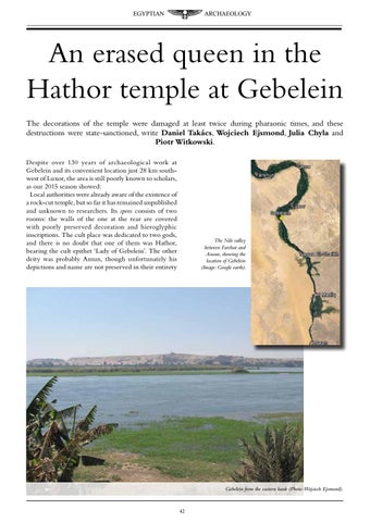 An erased queen in the Hathor temple at Gebelein The decorations of the temple were damaged at least twice during pharaonic times, and these destructions were state-sanctioned, write Daniel Takács, Wojciech Ejsmond, Julia Chyla and Piotr Witkowski. Despite over 130 years of archaeological work at Gebelein and its convenient location just 28 km southwest of Luxor, the area is still poorly known to scholars, as our 2015 season showed: Local authorities were already aware of the existence of a rock-cut temple, but so far it has remained unpublished and unknown to researchers. Its speos consists of two rooms: the walls of the one at the rear are covered with poorly preserved decoration and hieroglyphic inscriptions. The cult place was dedicated to two gods, and there is no doubt that one of them was Hathor, bearing the cult epithet ‘Lady of Gebelein’. The other deity was probably Amun, though unfortunately his depictions and name are not preserved in their entirety