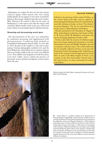 Daniel Takács is a graduate student at the Department of Oriental Studies in Egyptology at the University of Warsaw, who is currently funded by the International Visegrad Fund and working on the publication of the speos. Wojciech Ejsmond is a PhD student of archaeology at the University of Warsaw and director of the Gebelein Archaeological Project. Julia Chyla is a PhD student of archaeology at the University of Warsaw, field director of the project and working with Piotr Witkowski (MA student of the Institute of Archaeology of the University of Warsaw) on the documentation of the speos. The research was financed by the Consultative Council for Students’ Scientific Movement of the University of Warsaw and the University of Warsaw Foundation. 45