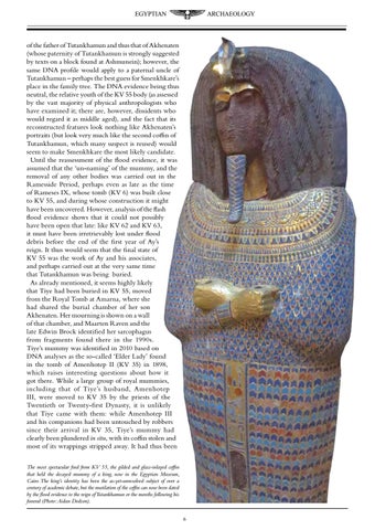 of the father of Tutankhamun and thus that of Akhenaten (whose paternity of Tutankhamun is strongly suggested by texts on a block found at Ashmunein); however, the same DNA profile would apply to a paternal uncle of Tutankhamun – perhaps the best guess for Smenkhkare’s place in the family tree. The DNA evidence being thus neutral, the relative youth of the KV 55 body (as assessed by the vast majority of physical anthropologists who have examined it; there are, however, dissidents who would regard it as middle aged), and the fact that its reconstructed features look nothing like Akhenaten’s portraits (but look very much like the second coffin of Tutankhamun, which many suspect is reused) would seem to make Smenkhkare the most likely candidate. Until the reassessment of the flood evidence, it was assumed that the ‘un-naming’ of the mummy, and the removal of any other bodies was carried out in the Ramesside Period, perhaps even as late as the time of Rameses IX, whose tomb (KV 6) was built close to KV 55, and during whose construction it might have been uncovered. However, analysis of the flash flood evidence shows that it could not possibly have been open that late: like KV 62 and KV 63, it must have been irretrievably lost under flood debris before the end of the first year of Ay’s reign. It thus would seem that the final state of KV 55 was the work of Ay and his associates, and perhaps carried out at the very same time that Tutankhamun was being buried. As already mentioned, it seems highly likely that Tiye had been buried in KV 55, moved from the Royal Tomb at Amarna, where she had shared the burial chamber of her son Akhenaten. Her mourning is shown on a wall of that chamber, and Maarten Raven and the late Edwin Brock identified her sarcophagus from fragments found there in the 1990s. Tiye’s mummy was identified in 2010 based on DNA analyses as the so-called ‘Elder Lady’ found in the tomb of Amenhotep II (KV 35) in 1898, which raises interesting questions about how it got there. While a large group of royal mummies, including that of Tiye’s husband, Amenhotep III, were moved to KV 35 by the priests of the Twentieth or Twenty-first Dynasty, it is unlikely that Tiye came with them: while Amenhotep III and his companions had been untouched by robbers since their arrival in KV 35, Tiye’s mummy had clearly been plundered in situ, with its coffin stolen and most of its wrappings stripped away. It had thus been The most spectacular find from KV 55, the gilded and glass-inlayed coffin that held the decayed mummy of a king, now in the Egyptian Museum, Cairo. The king’s identity has been the as-yet-unresolved subject of over a century of academic debate, but the mutilation of the coffin can now been dated by the flood evidence to the reign of Tutankhamun or the months following his funeral (Photo: Aidan Dodson). 6