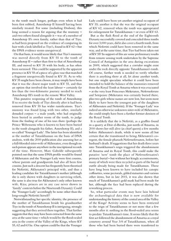 in the tomb much longer, perhaps even when it had been first robbed, Amenhotep II himself having been similarly treated. For some (including Dodson), this long seemed a reason for arguing that the mummy – and two others found alongside it – was of a member of Amenhotep II’s own family, rather than that of Tiye, as had been proposed on the evidence of comparing its hair with a lock labelled as Tiye’s, found in KV 62 – but the DNA evidence seems unequivocal. On that basis, it would seem likely that Tiye’s mummy was moved directly from KV 55 to the tomb of Amenhotep II – rather than first to that of Amenhotep III, and moved to KV 35 with his body, as has often been surmised. This could be supported by the apparent presence in KV 55 of a piece of a glass vase that matched a fragment unequivocally found in KV 35. As to why KV 35 might have been chosen, it may simply have been that it was the closest major tomb to KV 55, and thus an option that involved the least labour – certainly far less than the two-kilometre journey needed to reach Amenhotep III’s tomb in the remote West Valley. This putative reopening of the tomb of Amenhotep II to receive the body of Tiye directly after it had been removed from KV 55 has wider ramifications. Tiye’s mummy was found lying with two other, similarly denuded corpses – a male youth, who had originally been buried in another room of the tomb, to judge from the finding of one of his toes there (perhaps the Prince Webensenu who is known to have been buried in the tomb alongside his father, Amenhotep II), and a so-called ‘Younger Lady’. The latter has been identified as the mother of Tutankhamun on the basis of DNA analysis, with the 2010 publication also assessing her as a full-blooded sister-wife of Akhenaten, even though no such person appears anywhere in the inscriptional records of the time. However, Marc Gabolde subsequently pointed out that the same DNA profile would be found if Akhenaten and the Younger Lady were first cousins, whose parents and grandparents had also all been first cousins. Just such a descent has frequently been theorised for Nefertiti, Akhenaten’s principal wife, and thus a leading candidate for Tutankhamun’s mother (although she is only shown with daughters in surviving reliefs, the same is also true for Akhenaten’s only other known wife, Kiya; princes are in any case never shown in ‘family’ contexts before the Nineteenth Dynasty). Could the ‘Younger Lady’ accordingly be none other than the long-sought Nefertiti herself? Notwithstanding her specific identity, the presence of the mother of Tutankhamun beside his grandmother Tiye in the tomb of Amenhotep II is intriguing, strongly suggesting that they arrived there together. That further suggests that they may have been extracted from the same area at the same time – which would be the flood-sealed area in the centre of the Valley of the Kings, where KV 55, 62 and 63 lie. One option could be that the Younger