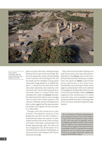 Many of the structures built in Ptolemaic and early Roman times were later dismantled or destroyed as the temenoi were turned into a fortress at the end of the 3rd century. In modern times, the search for sebakh caused further serious destructions in the sacred area. Nevertheless, the overall layout of the centre begins to surface slowly. Further work is planned to investigate the transformations that occurred in and around the temples, while an anastylosis programme (the reconstruction of a ruined monument using, as far as possible, its original architectural elements) aims at restoring some of the structures described (opposite page, bottom).