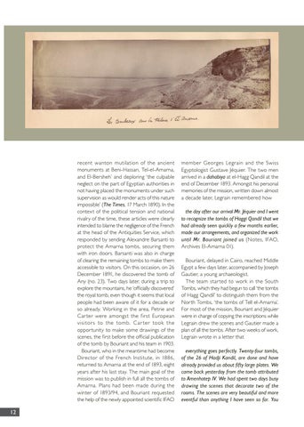 recent wanton mutilation of the ancient monuments at Beni-Hassan, Tel-el-Amarna, and El-Bersheh’ and deploring ‘the culpable neglect on the part of Egyptian authorities in not having placed the monuments under such supervision as would render acts of this nature impossible’ (The Times, 17 March 1890). In the context of the political tension and national rivalry of the time, these articles were clearly intended to blame the negligence of the French at the head of the Antiquities Service, which responded by sending Alexandre Barsanti to protect the Amarna tombs, securing them with iron doors. Barsanti was also in charge of clearing the remaining tombs to make them accessible to visitors. On this occasion, on 26 December 1891, he discovered the tomb of Any (no. 23). Two days later, during a trip to explore the mountains, he ‘officially discovered’ the royal tomb, even though it seems that local people had been aware of it for a decade or so already. Working in the area, Petrie and Car ter were amongst the first European visitor s to the tomb. Car ter took the opportunity to make some drawings of the scenes, the first before the official publication of the tomb by Bouriant and his team in 1903. Bouriant, who in the meantime had become Director of the French Institute, in 1886, returned to Amarna at the end of 1893, eight years after his last stay. The main goal of the mission was to publish in full all the tombs of Amarna. Plans had been made during the winter of 1893/94, and Bouriant requested the help of the newly appointed scientific IFAO