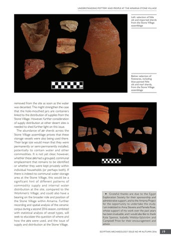 removed from the site as soon as the water was decanted. This might strengthen the case that the hole-mouthed jars are containers linked to the distribution of supplies from the Stone Village. However, further consideration of supply distribution at other desert sites is needed to shed further light on this issue. The abundance of zir sherds across the Stone Village assemblage proves that these storage vessels were also being used there. Their large size would mean that they were permanently or semi-permanently installed, potentially to contain water and other commodities. It is not yet clear, however, whether these zirs had a grouped, communal emplacement that remains to be identified or whether they were kept privately within individual households (or perhaps both). If there is indeed no communal water storage area at the Stone Village, this would be a signif icant hint of different pat terns of commodit y supply and inter nal water distribution at the site, compared to the Workmen’s Village, and could also have a bearing on the broader role and position of the Stone Village within Amarna. Fur ther recording and spatial analysis of the ceramic corpus during a second 2016 season, combined with statistical analysis of vessel types, will seek to elucidate this question of where and how the zirs were used, and the issue of supply and distribution at the Stone Village.