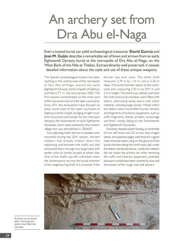 An archery set from Dra Abu el-Naga Even a looted burial can yield archaeological treasures: David García and José M. Galán describe a remarkable set of bows and arrows from an early Eighteenth Dynasty burial at the necropolis of Dra Abu el-Naga, on the West Bank of the Nile at Thebes. Extraordinarily well preserved, it reveals detailed information about the style and use of these antique weapons. The Spanish archaeological mission has been working in the central area of the necropolis of Dra Abu el-Naga, around the early Eighteenth Dynasty tomb-chapels of Djehuty and Hery (TT 11–12), since January 2002. The first seasons concentrated on the inner part of the monument and on their open courtyards. Since 2011 the excavations have focused on areas south-west of the open courtyard of Djehuty’s tomb-chapel, bringing to light mudbrick structures and burials, for the most part dating to the Seventeenth or early Eighteenth Dynasties, which were covered by the modern village that was demolished in 2006/07. Two adjoining shafts laid out in parallel were recorded during the 2015 season. Ancient robbers had already broken down the separating wall between the shafts and also connected them through two large holes with earlier rock-cut tombs located at either side. One of the shafts was left unfinished when the stonemasons ran into the burial chamber of the neighbouring shaft. It is uncertain if the