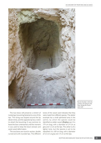 tones of the wood used indicates that they were made from different species. The darker example has a small splintered area in the centre, by which the species could be identified as sidder wood (Ziziphus sp.). It is 174 cm long, with a diameter of 2.4 cm at grip and 1.2 cm at the tips. The other is of a lighter tone, but the species is yet to be identified. It is 169 cm long, with a diameter of 2.3 cm at grip and 1.4 cm at the tips. EGYPTIAN ARCHAEOLOGY ISSUE NO 49 AUTUMN 2016